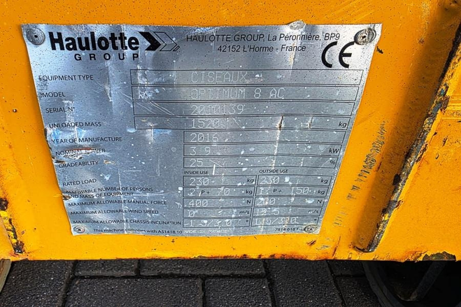Check the technical data of the unit, picked out from the catalog of HAULOTTE Optimum 8 Scissor lift.